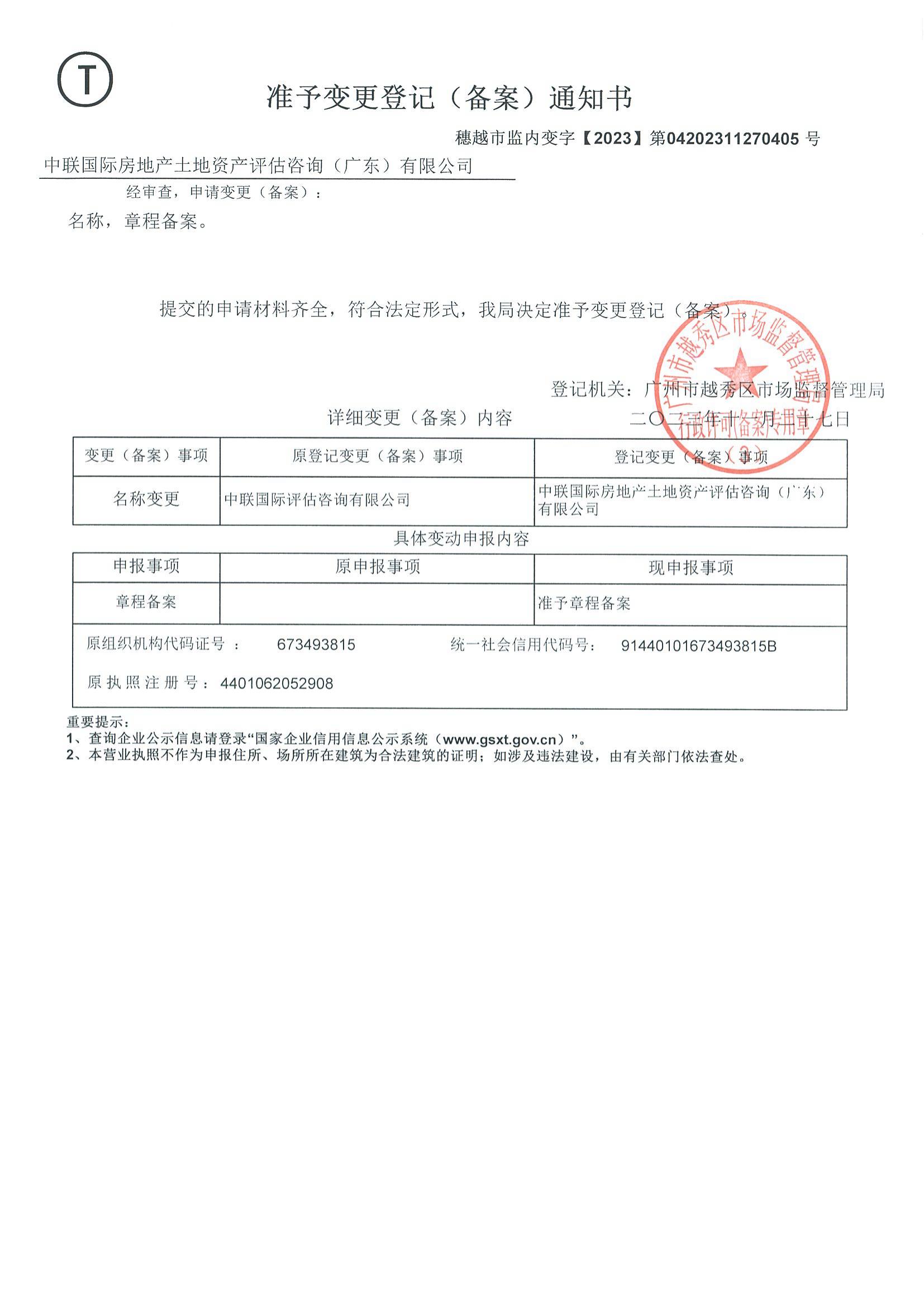 為整合多種評估資源,完善房地產(chǎn)估價資質(zhì),更加全方位、專業(yè)、細致地提供資產(chǎn)評估服務(wù),按照《企業(yè)名稱登記管理規(guī)定實施辦法》(2023年8月29日國家市場監(jiān)督管理總局令第82號公布,自2023年10月1日起施行),中聯(lián)國際評估咨詢有限公司于2023年12月10日正式更名為“中聯(lián)國際房地產(chǎn)土地資產(chǎn)評估咨詢(廣東)有限公司”。